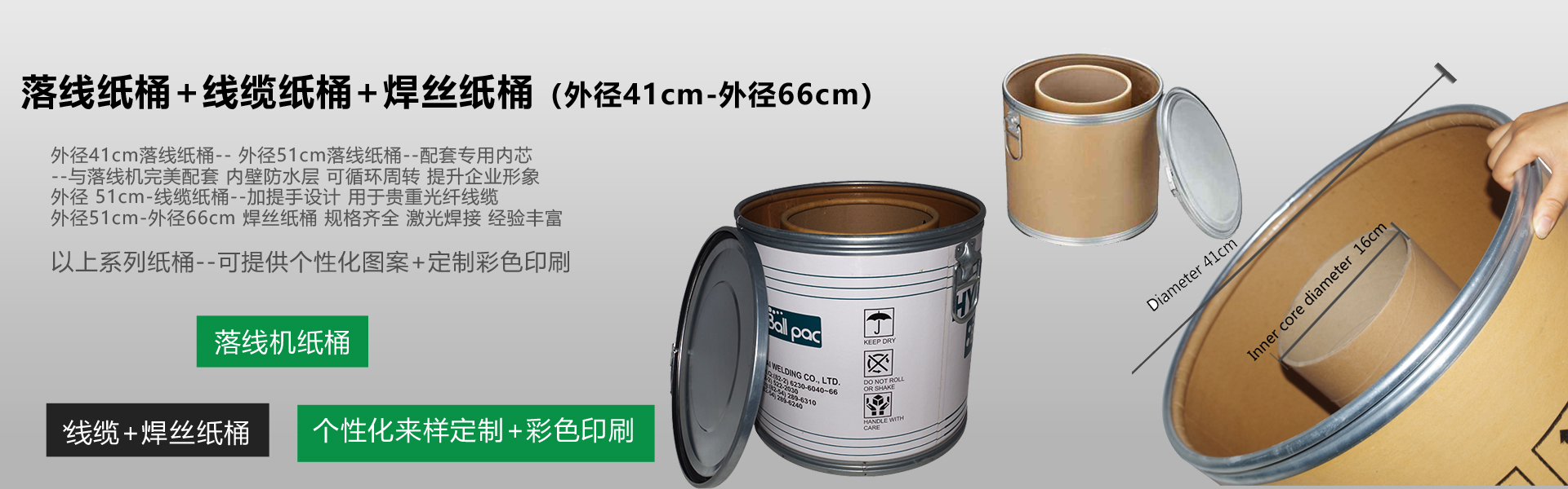 南京盛江包裝有限公司,9年致力于:紙桶,紙板桶,線纜桶,焊線桶,方紙桶,密實紙箱,全紙桶,pur紙桶,直徑28-66cm,高度30-110cm,可滿足不同客戶的定制需求。我們產品種類齊全,質量過硬,廣泛用于電線電纜,焊絲,化工、醫藥、食品添加劑類的包裝。公司占地面積2500平方米,其中建筑面積1800平方米。公司引進國外自動化生產設備,年生產量80多萬只。致力于根據客戶具體要求、量身定做各種規格的...